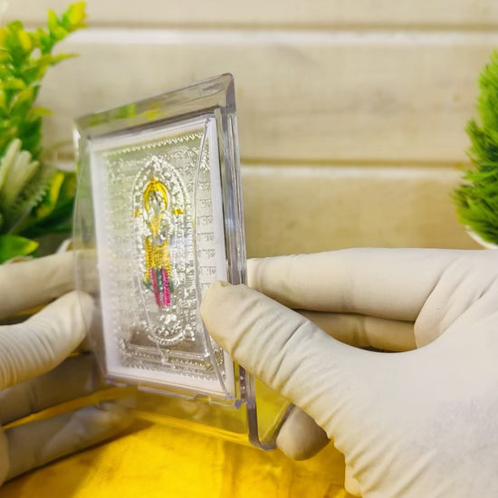 Embrace the sacred presence of Bhagwan Shree Ram with this 999 Pure Silver Shree Ram Darshan Frame, intricately designed and encased in a protective crystal casing. The frame features a detailed depiction of Lord Ram standing in divine elegance, with the sacred mantra "Jai Shree Ram" inscribed in the background, symbolizing strength, righteousness, and devotion. The hand-painted accents in gold, green, and pink add a touch of artistic beauty to this divine masterpiece.